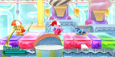 Kirby travels through stages by jumping back and forth between the foreground and background. He must use more than 25 Copy Abilities to borrow enemy powers to overcome various obstacles.