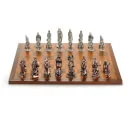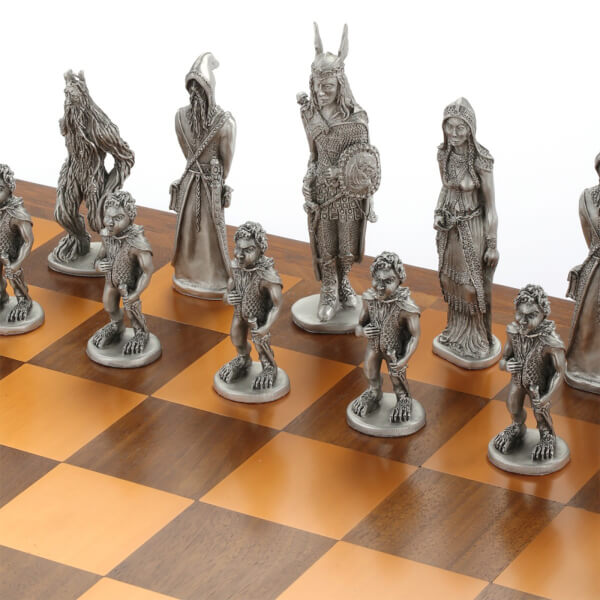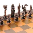 The battle for Middle-earth begins. Aragorn and Galadriel lead a band of Ents, Wizards and Hobbits against Sauron and Shelob's horde of Saruman, Gollum, Dragons and Orcs. Cast in pewter, with copper plating to distinguish the opposing armies, play takes place on a chessboard made of Merbau wood, nyatoh ply with walnut veneer, and pewter marquetry.