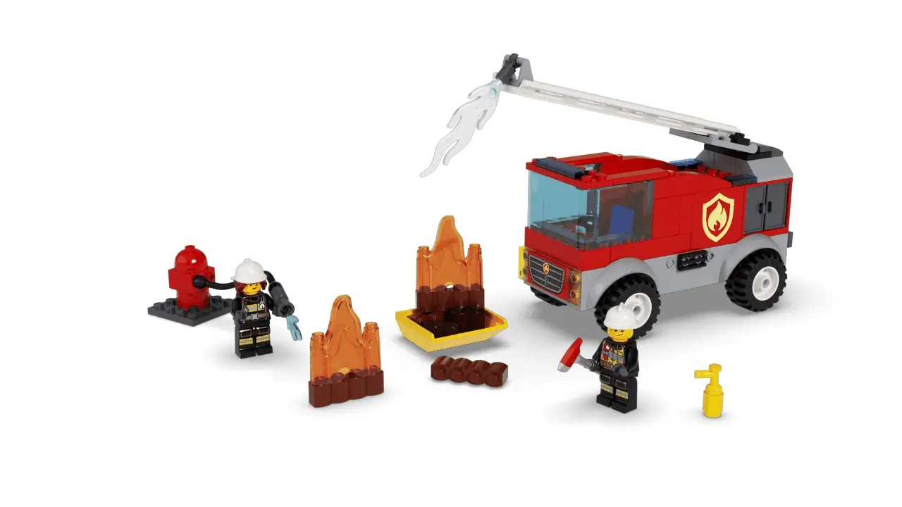 - What's in the box? There's a toy fire engine with a ladder and extinguisher, a water hydrant and stackable LEGO® flames, plus firefighter and LEGO City TV fire chief Freya McCloud minifigures.
