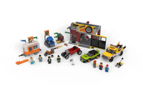 It's all go at Tread Octane's Tuning Workshop! Whacky handyman Harl Hubbs is working on his rocket-powered motorcycle, Tread is welding his prize hotrod and the mechanic has arrived in the breakdown truck with a broken-down sports car. Meanwhile, the city's most 'ahem!' honest car dealer is in his camping trailer preparing yet another of his special deals! Join the fun with this cool LEGO® City set!