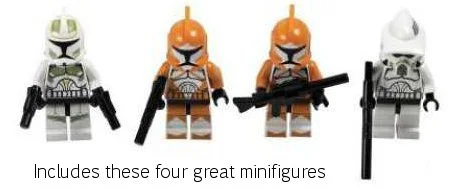 • Four Minifigures: Clone Commander, 2 Bomb Squad Clones and one ARF Clone
