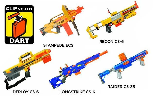 Keep the action flowing and quickly reload your gun with the Flip Clip kit. Snap the clips together, fill them with the 30 included Nerf Darts and load them into your Nerf Gun.